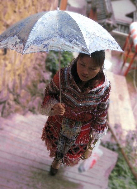 Lady ascends steps of Buddhist temple in Yunnan province.